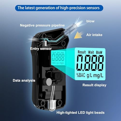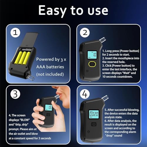 【Easy to use】Just insert the 3* AAA batteries, then need to press the button for seconds to start, and 10 seconds to warm up, then blow for 3-5 seconds, the result will be shown on the LCD screen later. There is 3 unit measurement to choose %BAC, g/l, mg/l, simply double-click the switch. (Batteries are NOT included)
