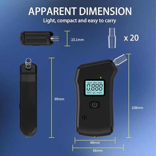 【20 Interchangeable Mouthpieces】Alcohol Tester comes with 20 mouthpieces, the mouthpieces can be cleaned and recycled. Super compact design, breathalyzer fits in your pocket and is easy to hold and carry wherever you go.