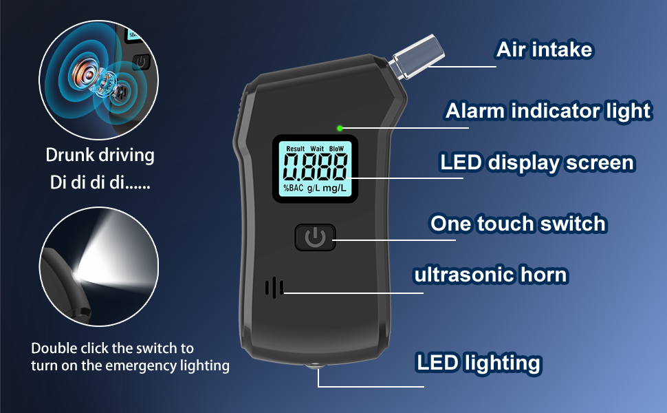 【Auto-Alarm Function】When the test result is greater than 0.2 g / L, 0.03 % BAC, or 0.15mg / L, the indicator light of the alcohol detector will change to inform you so that you can make a better judgment.