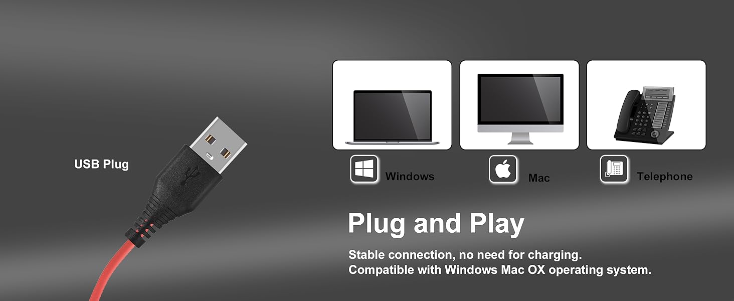 - 【Universal USB Compatibility】PC headset with microphone works with Windows 2000/7/8/10/XP/Vista, Mac OS X and most leading UC Platforms, Softphone. The USB-A Plug of call center headset can be directly connected to Laptop, Computer, PC, Chromebook, iMac, phone and more devices with USB A port. Plug-and-Play, no drivers needed.