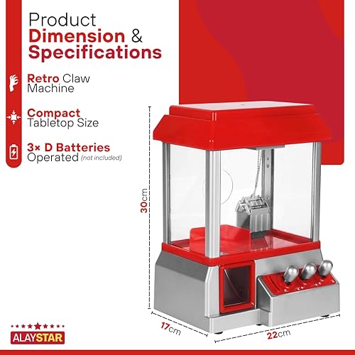 - – Classic mini claw machine with retro red & silver design, arcade-style controls and music – brings the excitement of the fairground into your living room.