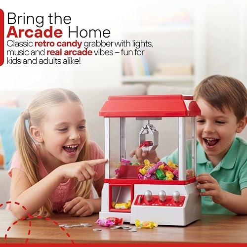 ALAYSTAR Candy Grabber Machine with Music & 24 Coins Mini Arcade Claw Toy for Kids & Adults Sweet Retro Catcher Game Refillable Candy Dispenser Party Fun Gift