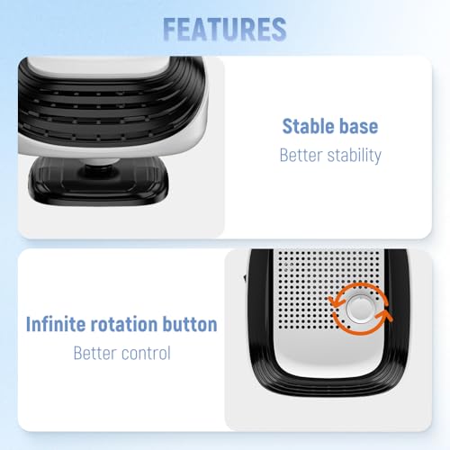 - 【360° ROTATABLE DESIGN】The fully adjustable 360-degree swivel allows you to direct heat exactly where you need it. Quickly defrost your windscreen or keep your feet warm—complete flexibility for maximum comfort.