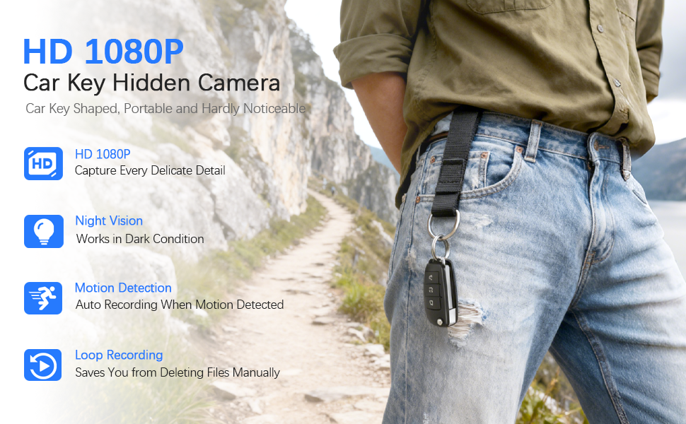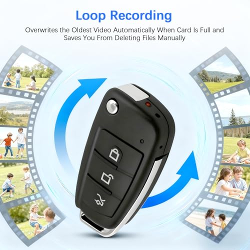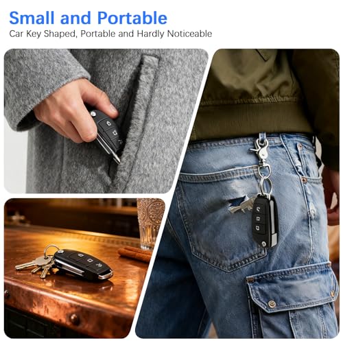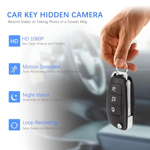 - 【Easy to Carry and Use】With compact size and car key shape, the mini hidden camera is easy to carry and won’t draw attention. Meanwhile, this spy hidden camera is simple and easy to operate, no complicated setting process. You just need to insert a SD card (SD CARD NOT INCLUDED IN PACKAGE) and power on the discreet camera then you can use it as your needs