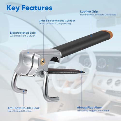 Car Steering Wheel Lock with Double Hook, Airbag Alarm, Heavy Duty Anti-Theft & Anti-Saw Car Protection Locks Includes 2 Keys, Universal Fit for Most Cars, Vans, and SUVs