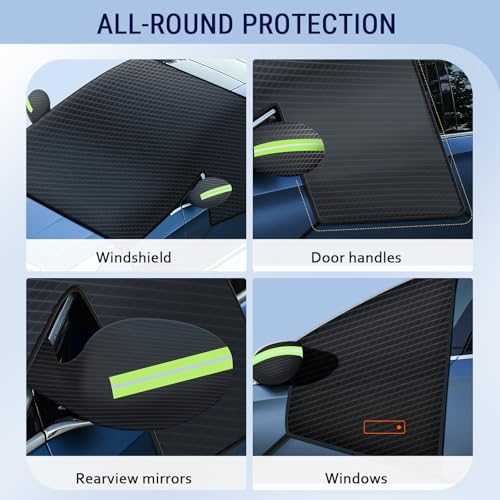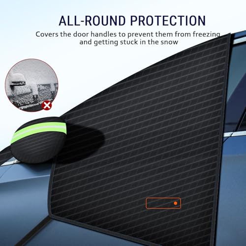 Completely covers your door handles for easy use – Our windshield cover completely covers your door handles, eliminating the problem of icy door handles. No tools are required for use, and there's no need to clamp it to your door, ensuring rainwater doesn't flow down the cover into your car. The windshield comes with 10 magnets and 6 straps for secure attachment to your car's exterior.