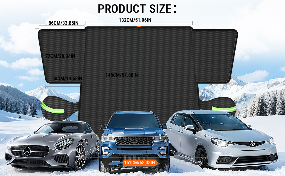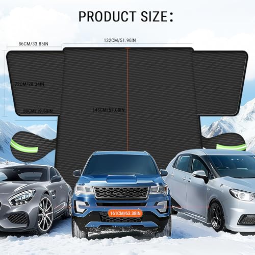 Extra-Large Windshield Cover: Measuring 218 x 161 x 145 cm (86 x 63 x 57 inches), our windshield cover offers increased coverage, perfectly protecting the windshield, side windows, door handles, wipers, and rearview mirrors. It fits almost all cars, including SUVs, protecting your vehicle from frost and snow. Its compact size makes it easy to store in your back seat, trunk, or backpack, making it a must-have car accessory.