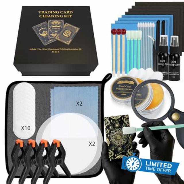 【Card Care Kit】17-in-1 Card Cleaning and Polishing Restoration Kit contains 1 storage box, 3 restoration sticks, 1 absorbent pad, 1 pair of gloves, 1 pair of tweezers, a 7x magnifying glass, 50 grams of polishing paste, 60 ml of cleaning solution and other items.Simple operation, divided into three steps: cleaning, restoration and polishing. It is easy to use for both beginners and professional collectors
