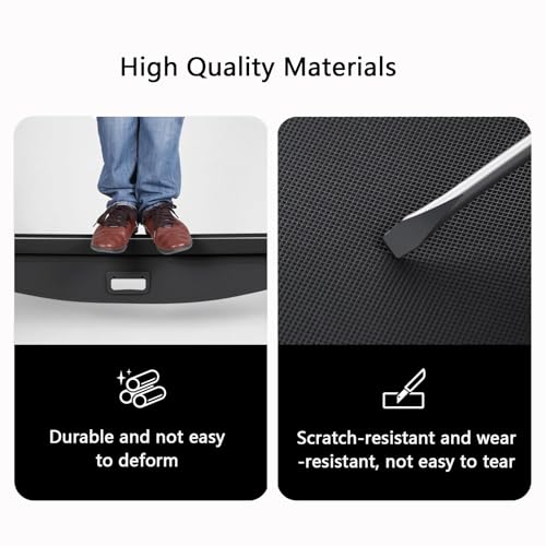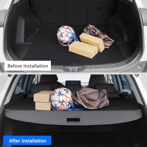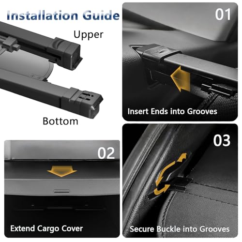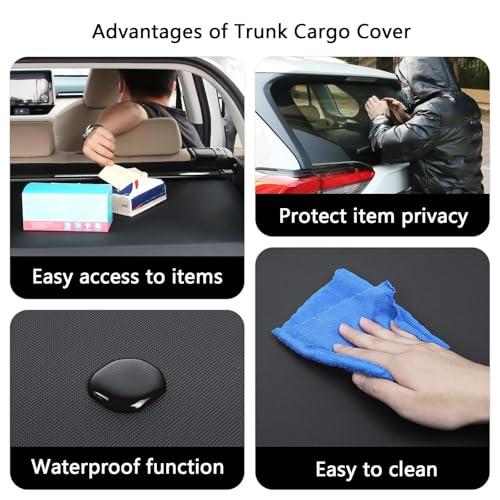 Function: 1.Durable & Reliable Cargo Cover: Waterproof, tear-resistant and built to last. 2.Privacy Protection: The retractable cargo cover organizer is easy to use by the handle on it. It creats a private room for your personal items and keep it safe from prying eyes, reducing theft risk. 3.UV Protection: The car cargo cover shields your belongings from harmful UV rays. The cargo cover can block out UV rays, helping to keep your items in better condition. 4.Organized Your Cargo Room: The cargo trunk cover also helps keep things in place, reducing this risk. And it is easy to use. Just put the trunk organizer into the original slots in the trunk, no tools needed! Quick and hassle-free setup in minutes.