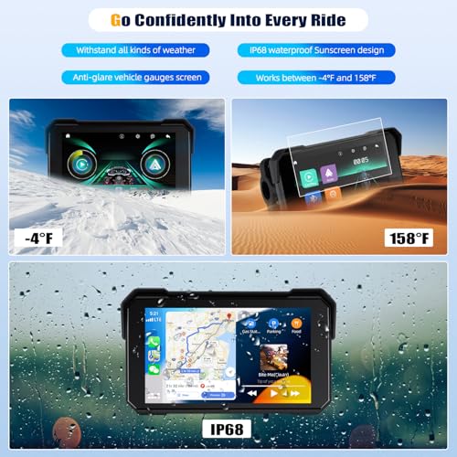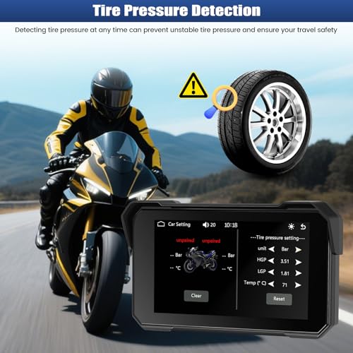 [IP68 Waterproof and Tire Pressure Monitoring] This wireless carplay for motorcycle features durable IP68 waterproof materials.The quality of the materials and craftsmanship give one confidence in their durability,easily withstanding the rigors of the road,ensuring the motorcycle screen remains functional and reliable in all weather conditions.Check tire pressure at any time to prevent unstable tire pressure and ensure your travel safety