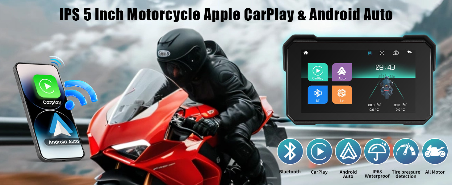 CarPlay Screen for Motorcycle,Portable Wireless Carplay/Android Auto for Motorcycle,5 inch IPS Waterproof Portable Radio GPS Display for Motorbike with Bluetooth,Tire Pressure Monitoring,TF Po
