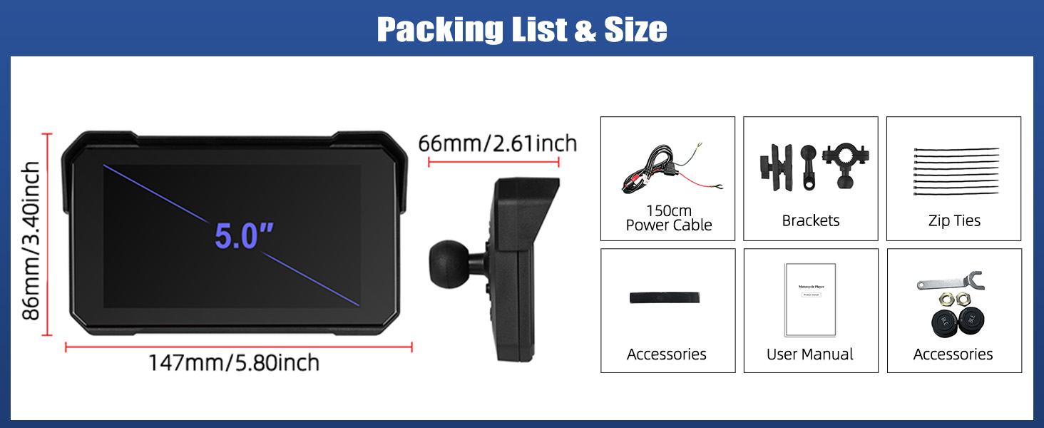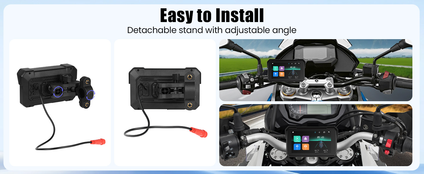 [Plug and Play] This wireless carplay for motorcycle is suitable for all motorcycles. You could mount it on the handlebars of your motorcycle, the package comes with a mounting kit and tools to ensure stability. All you need to do is plug the power cable into the port of the screen, connect the power adapter to your motorcycle's power supply and the device will turn on and be ready to use
