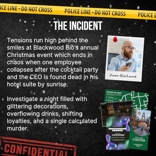 Gripping Seasonal Murder Mystery Game – A pharmaceutical company's Christmas Party turns into chaos when one member of staff is rushed to hospital, and hours later the CEO is found dead in his hotel room. Learn about the suspects and examine all of the evidence to bring the killer to light.