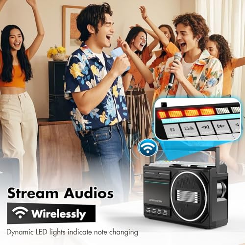 - BLUETOOTH SPEAKER: Enhance the fun with our Bluetooth speaker featuring karaoke capabilities. It combines the functionality of a cassette player with Bluetooth audio to fill larger spaces with great sound.