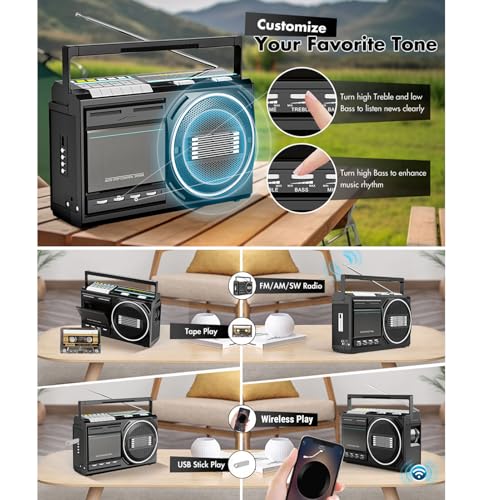 - PORTABLE FM/AM/SW RADIO: Enjoy your favorite channels with this portable stereo cassette radio, featuring multi band FM, AM, and SW radio capabilities for vibrant and clear playback of local broadcasts.