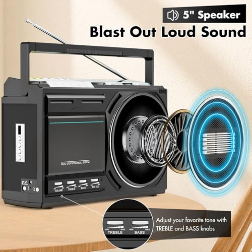 - POWERFUL 5 INCH SPEAKERS:This cassette tape player comes equipped with powerful stereo speakers with bass and treble adjustment knobs, enabling you to customize audio and enhance low end impact or brighten highs according to your preference.