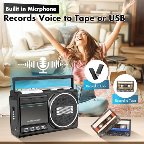 - SEAMLESS USB AND TAPE CONVERSION: Effortlessly record between USB and cassette tapes with this device. Digitize your cassette tapes and save them as MP3 files on a USB drive, or record tracks from USB onto cassettes for versatile playback.