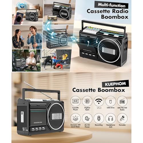 Cassette Player BT, Portable Retro Boombox Stereo USB Tape to MP3 Converter Recorder, AM/FM/SW Radio with Built in Microphone, Wireless Speaker for Home and Gifts (# 1)