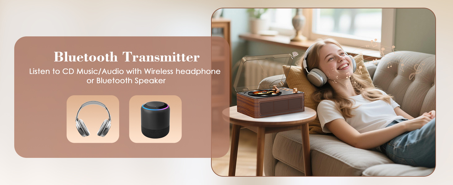 - CD Player with Bluetooth: This portable CD player has built-in Bluetooth transmitter and Bluetooth receiver, which not only connects to Bluetooth speakers and headphones, but also connects to Bluetooth signals from smartphone, laptop, tablet, and acts as a speaker to play wireless music. When connecting, if there are multiple Bluetooth receivers, the cd-player will be connected to the nearest and strongest Bluetooth device.