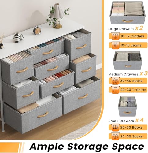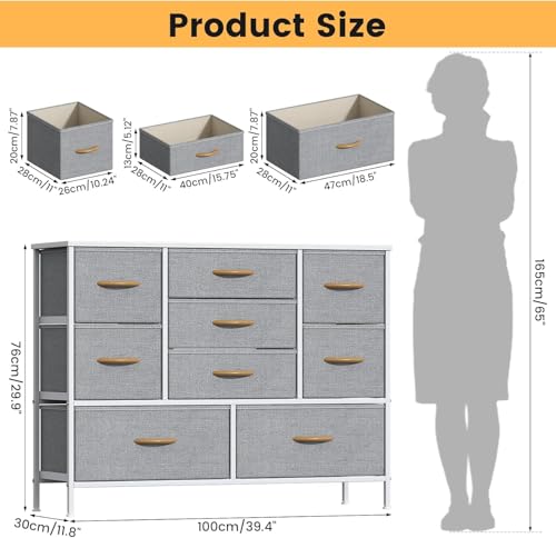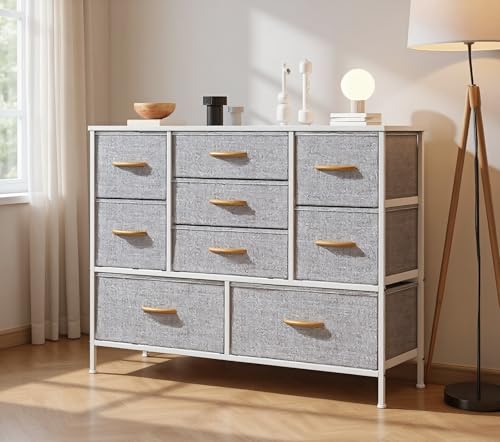 Drawer Fabric Dresser This 9-drawer chest of drawers (39.4″L x 11.8″W x 29.9″H) features 2 large + 4 medium + 3 small removable drawers, ideal for organizing lingerie, clothes, blankets, toys and accessories. Its slim profile fits bedrooms, nurseries, hallways and entryways, with a water-resistant MDF top for displaying lamps or decor. Crafted from reinforced metal frame and breathable non-woven fabric, it’s durable, easy to clean, and equipped with steel crossbars (anti-sagging), adjustable feet and anti-tip kit for safety. Versatile as a TV stand or storage organizer, it assembles quickly with clear instructions, video guide and full hardware—easy even for one person.