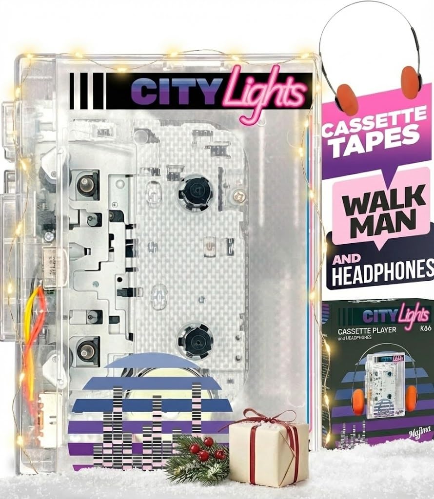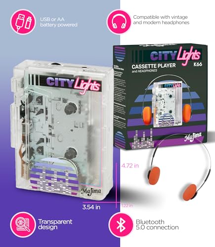 CityLights cassette player – the perfect blend of retro and modern Experience the best of both worlds with the CityLights cassette player. Designed for lovers of vintage style, this cassette player features a transparent retro body, Bluetooth connectivity and classic headphones with iconic orange foam. It’s the ultimate blend of 80s nostalgia and modern wireless technology, perfect for taking your music collection with you wherever you go. EXCEPTIONAL SOUND QUALITY WITH BLUETOOTH Enjoy superior sound whether you’re playing classic bands or streaming your favorite tracks wirelessly. PORTABLE, DURABLE & BLUETOOTH ENABLE Lightweight and durable, this cassette player ensures hours of uninterrupted playback and connects easily to wireless speakers or headphones. Compatible with old and new bands: Listen to your entire band collection, from vintage classics to brand new recordings, with excellent sound quality. A UNIQUE GIFT FOR MUSIC LOVERS Perfect for collectors and fans of retro technology, combining vintage aesthetics with modern functionality.