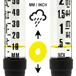 Marked in millimetres and inches, the tall transparent tube provides accurate rainfall measurement, while the bright floating disk highlights the level instantly for simple checks.