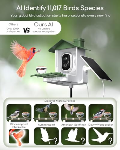 - The smart bird feeder with camera for outside contains knowledge on over 11k+ bird species worldwide (for just the price of a cup of coffee each month). Each time a new feathered friend arrives, it accurately identifies the species and adds it to your collection guide. The included bird encyclopedia lets you learn more about these delightful creatures while being entertained by them—making learning fun. This makes it the ideal gift for parents, children, and bird lovers.