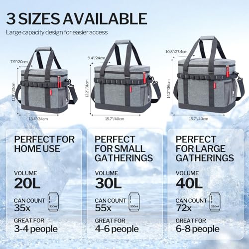 Cool Bag 20/30/40L, 12h Cooling, Large Foldable Picnic Bag, Cool Box, Portable Insulated Bag for Car & Shopping, Thermal Bag, Cooler Bag for Work, Picnic, Beach, Camping, BBQ