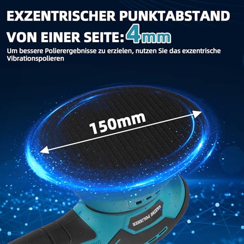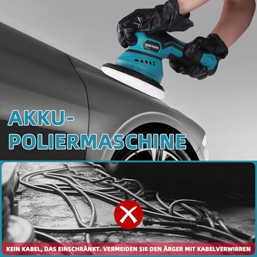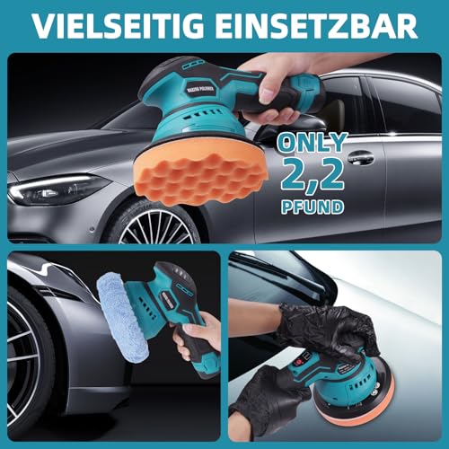 - 【Powerful & Efficient】Teodute cordless car buffer polisher has a built-in 900W high-efficiency brushless motor that provides a powerful double-acting random orbit with low noise, strong power, and excellent performance, with a maximum speed of 5500 RPM and an eccentric shaft design, which is designed to give the car polisher a larger fit on the car body surface and evenly distribute the wax, thereby improving polishing efficiency and precision, and polishing more efficiently.