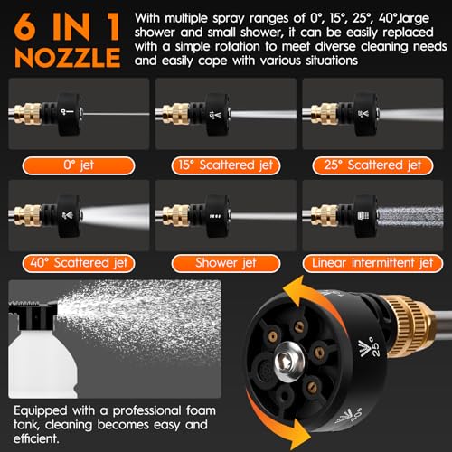【6-in-1 Multi-Function Nozzler】This portable pressure washer features a versatile 6-in-1 nozzle. Its integrated design eliminates the need for changing attachments and offers multiple spray patterns (0°, 10°, 25°, 40°, and shower mode) to easily handle a variety of cleaning tasks. It's perfect for watering plants, cleaning garden tools, bicycles, boats, and windows. The included foam bottle creates rich foam, making it convenient for washing cars, removing stains from doors and windows, and cleaning hard-to-reach areas.