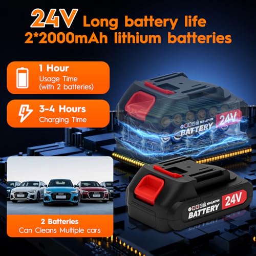 【2 Batteries for Non-Stop Cleaning】Tired of being interrupted while cleaning? Our cordless pressure washer comes with two high-performance, replaceable batteries. When one battery dies, simply switch to the other for uninterrupted cleaning. The powerful battery life is enough to remove even the toughest dirt from cars and curbs, ensuring effortless, uninterrupted cleaning.