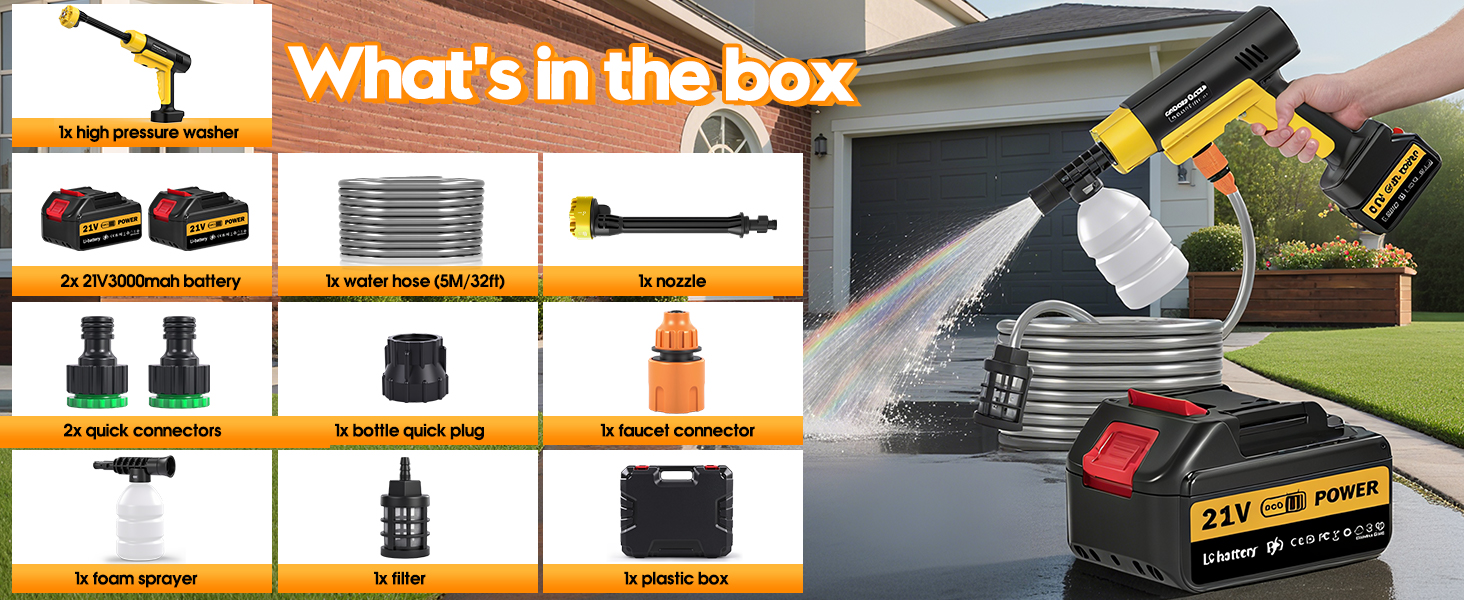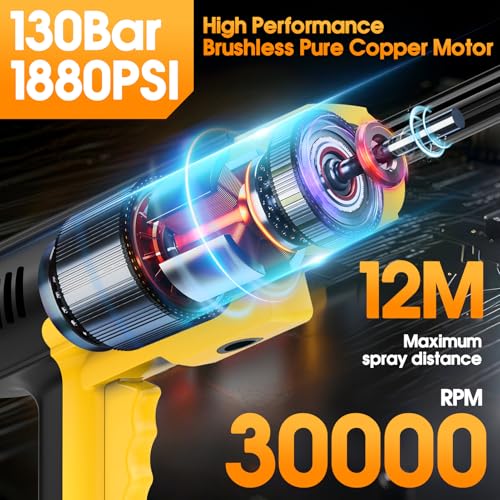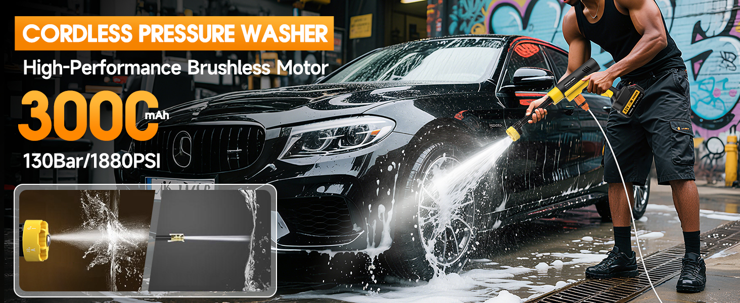 [Powerful Cleaning] This cordless pressure washer features a high-performance brushless pure copper motor with a maximum pressure of 130 bar and a spray rate of 8 L/min, providing ample power for outdoor cleaning while enjoying the convenience of cordless operation.
