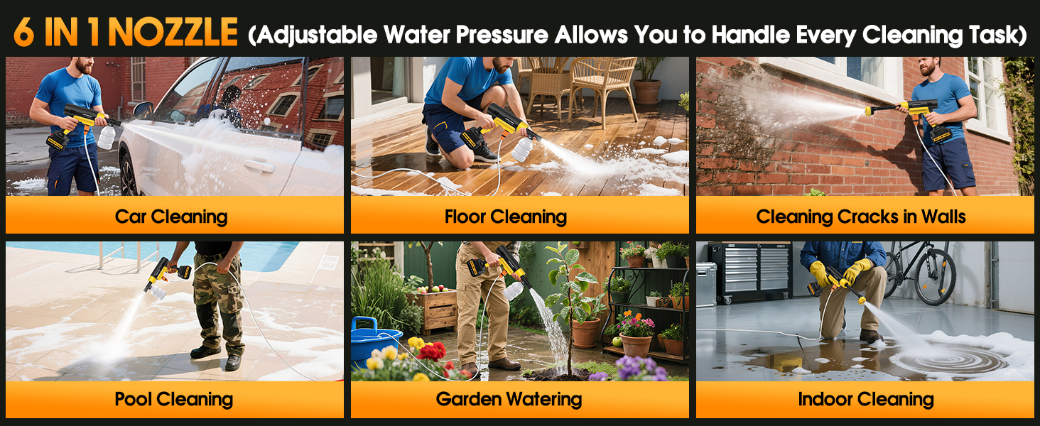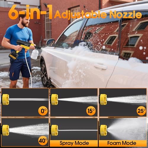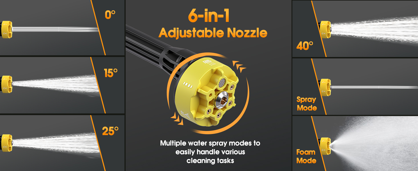 [6-in-1 Nozzle] This pressure washer features a multi-function nozzle that allows you to easily switch between different spray modes, including 0°/15°/25°/40°/fan spray/shower, to meet your various needs. Additionally, this cordless pressure washer comes with a foam tank, allowing you to add detergent to create a dense foam. This versatility ensures you can handle a variety of cleaning tasks with precision.