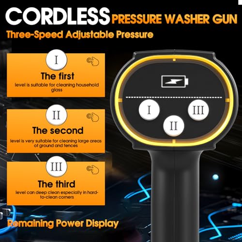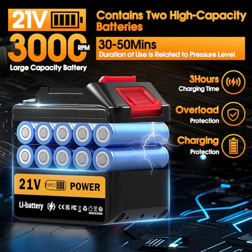 [Excellent Battery Life] Our cordless pressure washer comes with two high-performance 21V 3.0Ah tool batteries. Unlike traditional capacitor batteries, our battery pack delivers superior performance. Each battery has a runtime of approximately 30-50 minutes, depending on the water pressure. Furthermore, a battery status indicator allows you to easily monitor the charge level.