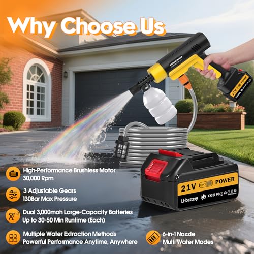 Cordless Pressure Washer, 130 Bar Portable Power Washer, Battery High Pressure Washer with 2×3.0Ah Batteries, 6 in 1 Adjustable Nozzl, 5m Hose, Jet Wash for Floor/Garden Cleaning & Watering