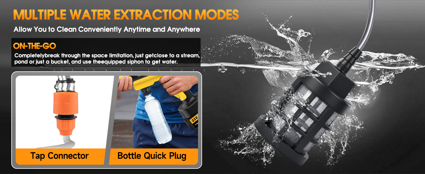 [Versatile Connection and Outdoor Convenience] The pressure washer comes with a faucet adapter for easy connection to 3/4-inch and 1/2-inch hose threads, as well as other types of faucets. Its self-priming hose, with a built-in filter, draws clean water from sources like buckets, rivers, or lakes, making it ideal for camping, traveling, or remote cleaning. It's perfect for cleaning cars, boats, furniture, and more, delivering powerful performance anytime, anywhere.