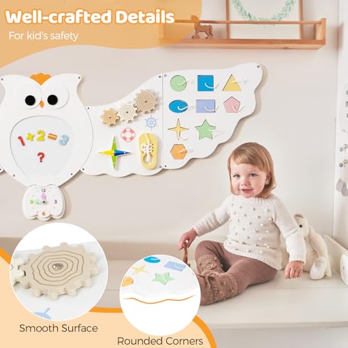 COSTWAY Activity Wall Busy Board Panels, 11 in 1 Wooden Sensory Wall Toy, Toddler Learning Activity Center for Education & Early Development (White Owl)