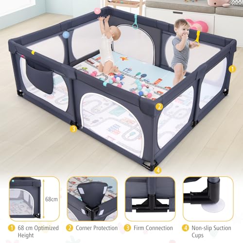 COSTWAY Baby Playpen, 189 x 158cm Toddler Fence with Mat, Ocean Balls, Pull Rings, Breathable Mesh, Infants Activity Play Yard for Indoor Outdoor (Dark Grey)