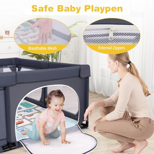 - 【All-around Visible & Safe Mesh】Designed with all-side mesh wall, the toddler playpen is safe to use. The visible and breathable mesh not only enables you to keep an eye on your baby but also makes babies feel secure. The large zipper door allows babies in and out easier and the external zipper design adds safety.