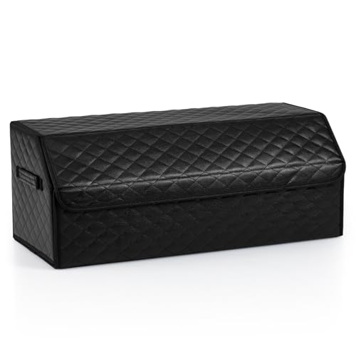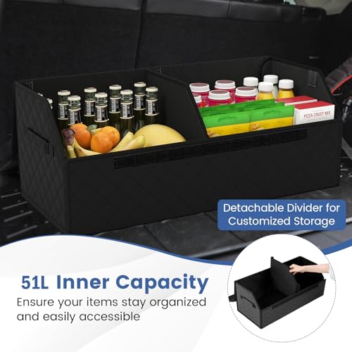 COSTWAY Boot Organiser Storage, Leather Foldable Car Trunk Organizer with Lid, Removable Divider, Collapsible Boot Storage Box for SUV, Sedan, Jeep, Camping and Home (51L, Diamond Shaped Surface)