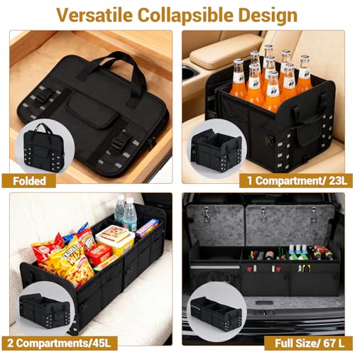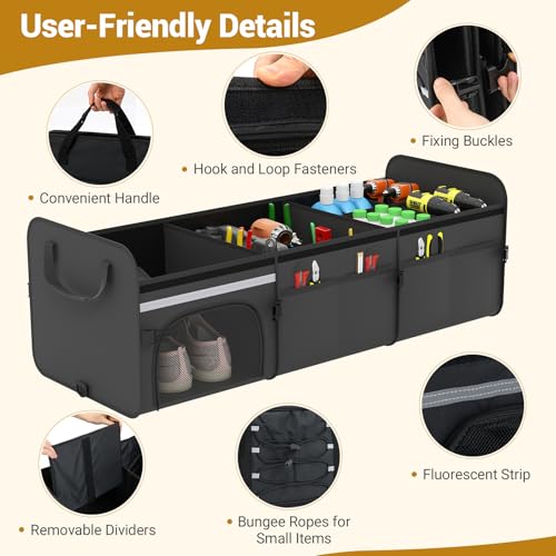 【Firm Placement】 With 2 adjustable straps and hook-and-loop fasteners, the car boot organiser can stay firm at the car trunk. Moreover, the reflective fluorescent strips make the truck organizer glow for nighttime safety.