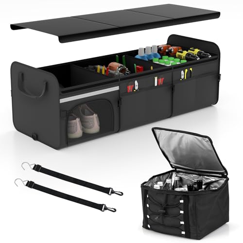 【Convenient Folding Design】 The folding design with removable lid makes this vehicle organizer collapse in seconds to slide under a seat until the next adventure calls. The convenient handle ensures better portability, and the fixing buckles keep the organizer folded.