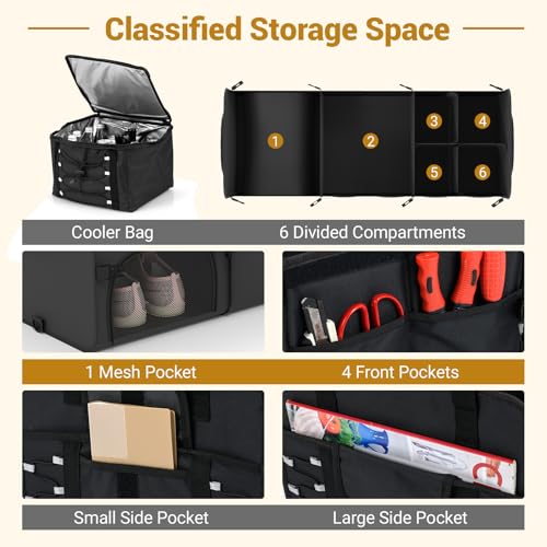 【Classified Storage Space】 6 divided compartments, 4 front pockets, a mesh pocket for shoes, a large side pocket, 1 small side pocket and bonus bungee ropes enable this storage box to accommodate groceries and kits in order. And the removable dividers allow you to use it in 1/2/3 compartments for more flexibility.
