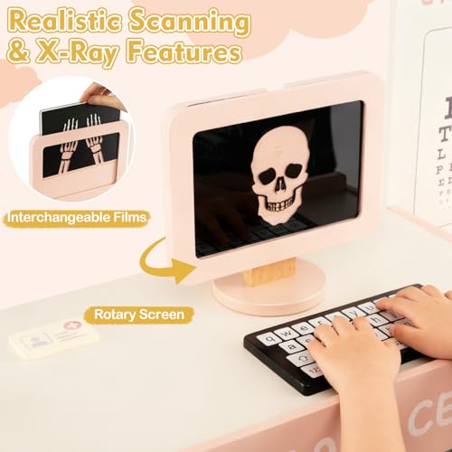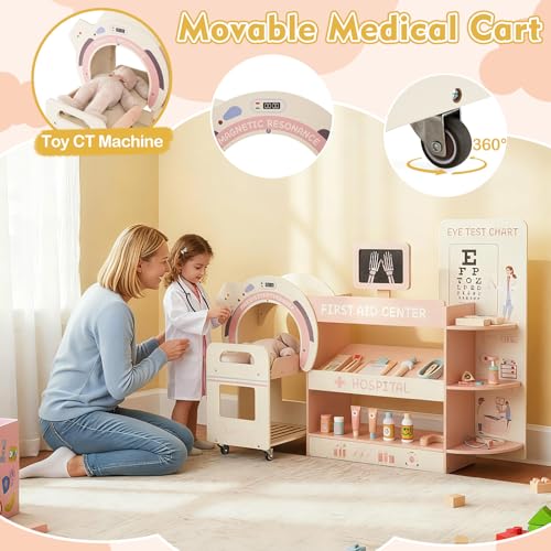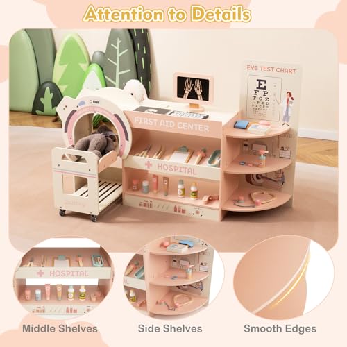 COSTWAY Kids Doctor Play Set, Wooden Checkup Medical Office Center with Eye Chart, Toy CT Machine, 20 Hospital Accessories, Toddler Pretend Hospital Playset Kit for Boys Girls (Pink)