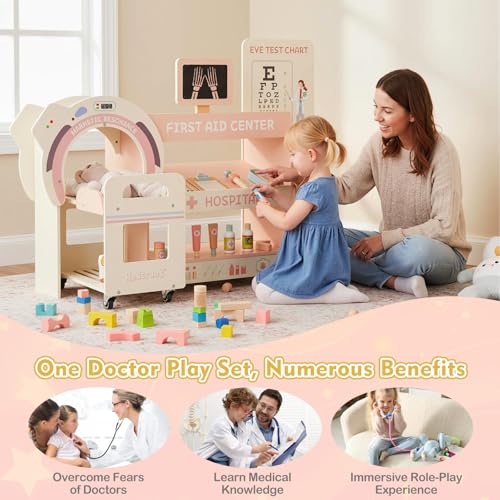 - 【Ample Storage Space】The kids doctor playset comes with multiple storage shelves to keep playtime organized and tidy. This helps cultivate good organizational habits from an early age. Moreover, the included CT trolley doubles as a versatile storage cart with smooth universal wheels, enabling kids to move their hospital essentials from room to room with ease.