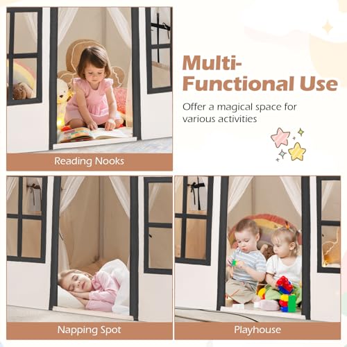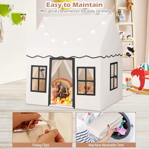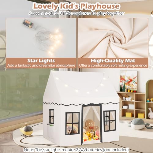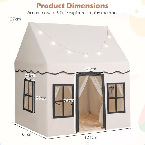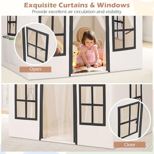 COSTWAY Kids Play Tent, Indoor Large Playhouse with Star Lights, Non-slip Mat and Windows, Castle Fairy Tents for 3-10 Years Boys Girls (Beige+Black)