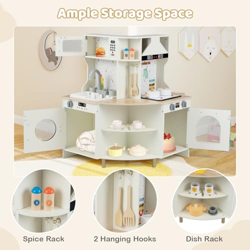 COSTWAY Kids Wooden Kitchen, Corner Pretend Play Kitchen with Realist Sound & Light, Working Faucet, Sink, Microwave, Dishwasher and Utensils, Children Cooking Chef Role Playset for Boys Girls Ages 3+