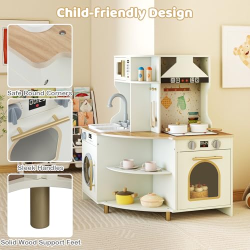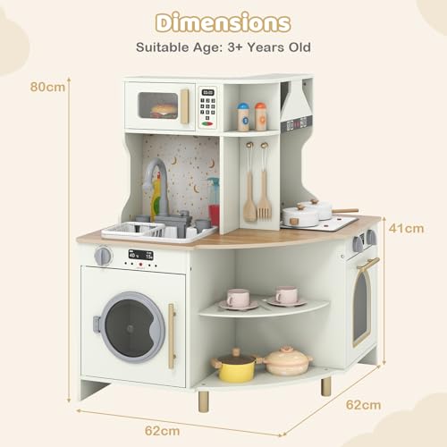【Space-smart & Child-friendly Design】The 62 x 62 x 80 cm L-shape hugs outward corners to save floor space, and rounded edges plus solid-wood feet give this toy kitchen rock-steady stability without sharp corners. Parents gain peace of mind knowing the sturdy frame can handle enthusiastic chefs while protecting tender skin.