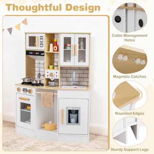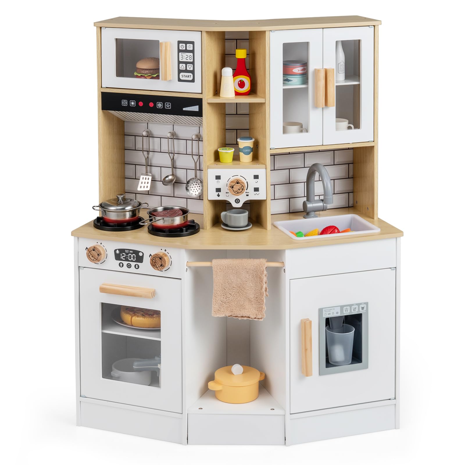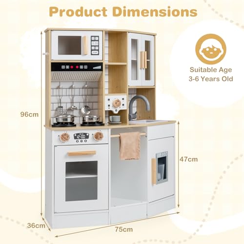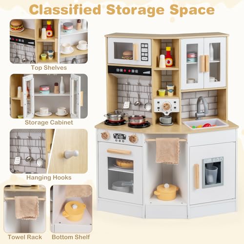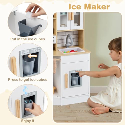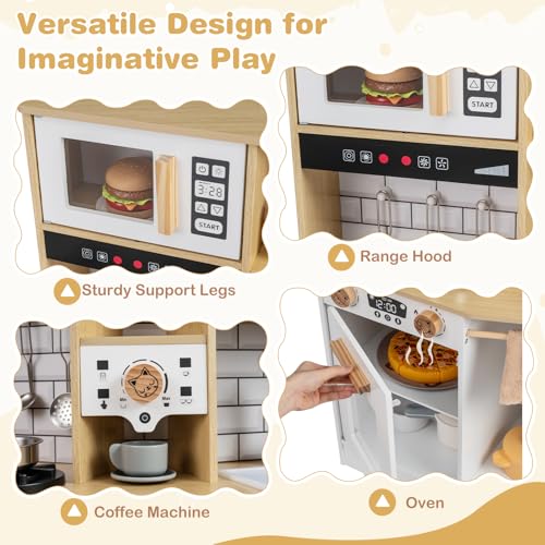 COSTWAY Kids Wooden Kitchen, Pretend Play Kitchen with Stove, Sink, Range Hood, Ice Maker, Coffee Machine, Microwave, Oven, Sound & Light, Children Chef Role Playset for Boys Girls (Natural + White)
