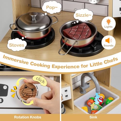 【Realistic Role-play Experience】This kids kitchen set features stoves with realistic sound and light effects, enhancing imaginative role-play for children. With range hood, sink, faucet and rotation knobs, the toy kitchen mimics real cooking experience, making playtime immersive and fun.